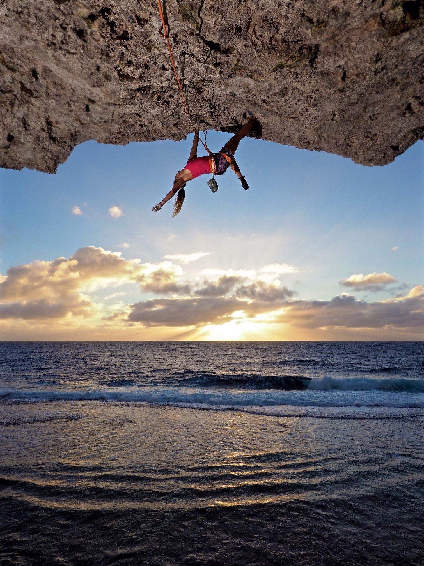 Cover photo: Nina Caprez belayed by Solenne Piret climbing on the impressive cliff of Makatea. Colors are as impressive as the rock-quality © Jeremy Bernard