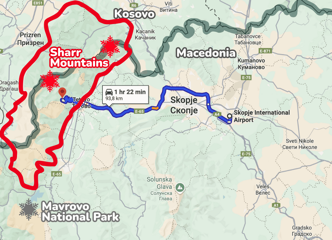 From Skopje you can then rent a car and drive to Popova Shapka, or if you’re looking for a more sustainable ski-touring experience, you can take a bus to Tetovo and arrange a transfer on to Popova Šapka.
