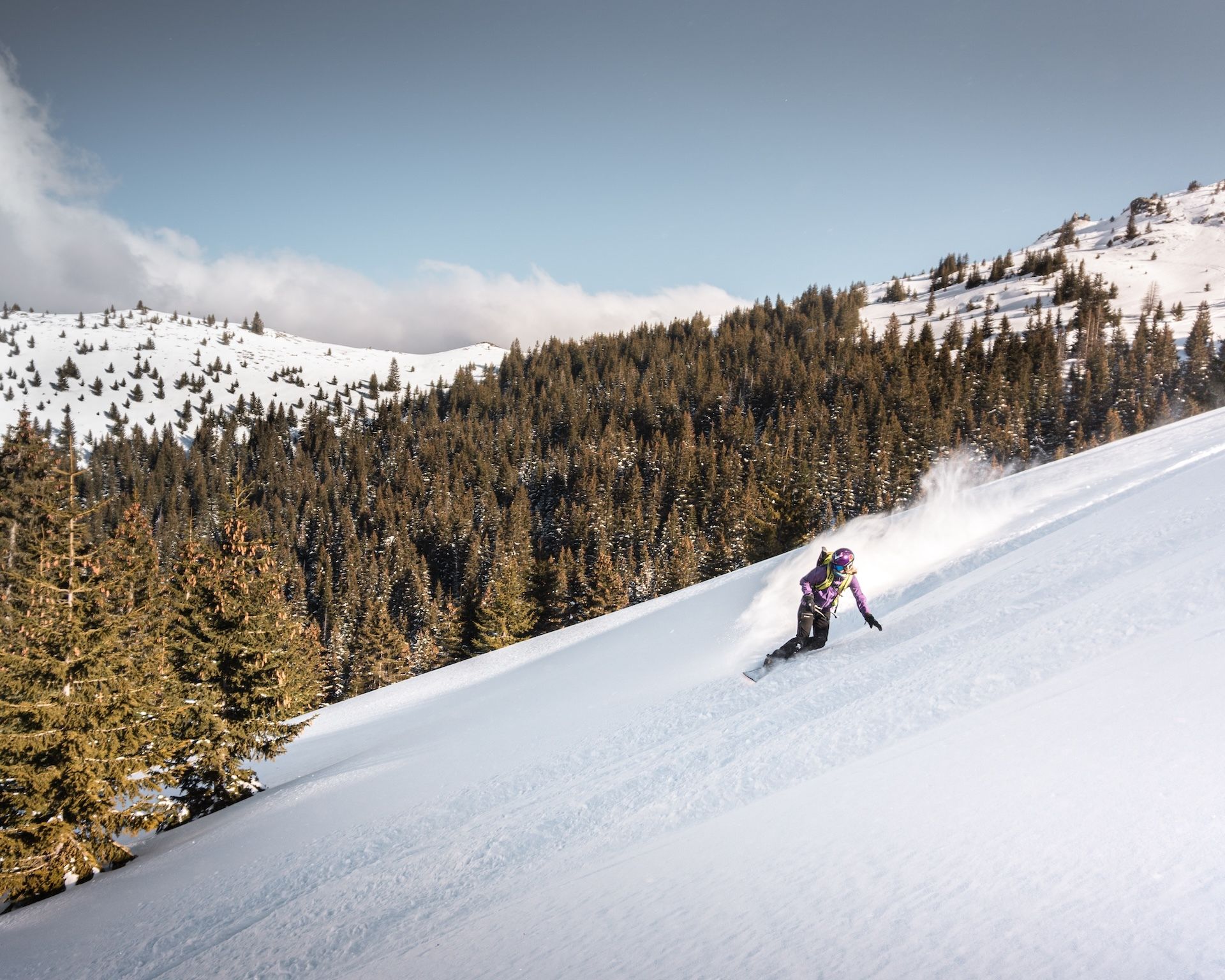 Steep ascent followed by a technical descent through powder fields and tree-lined trails.